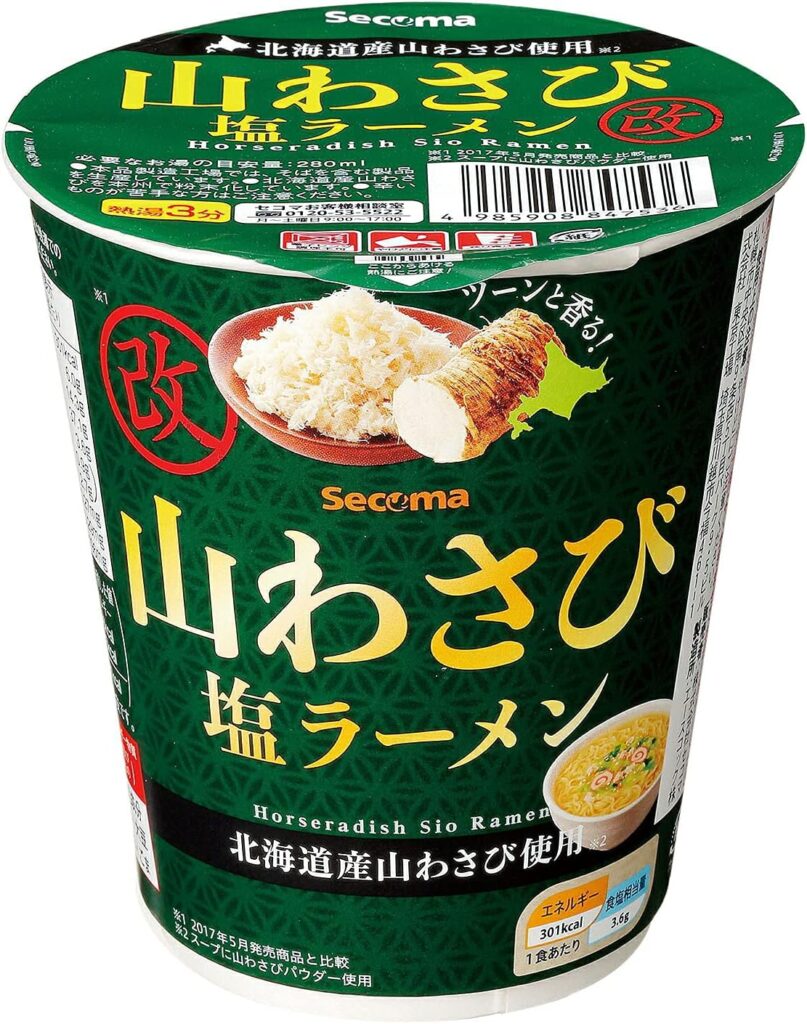 特に現在主流となっている「山わさび塩ラーメン改」は、パッケージに「刺激up!」と明記されている通り、その山わさび感が大幅に強化されました。従来の商品が魚介エキスを強調していたのに対し、「改」は山わさびパウダーとチキン調味料の構成を際立たせることで、山わさび度が格段にアップしています。